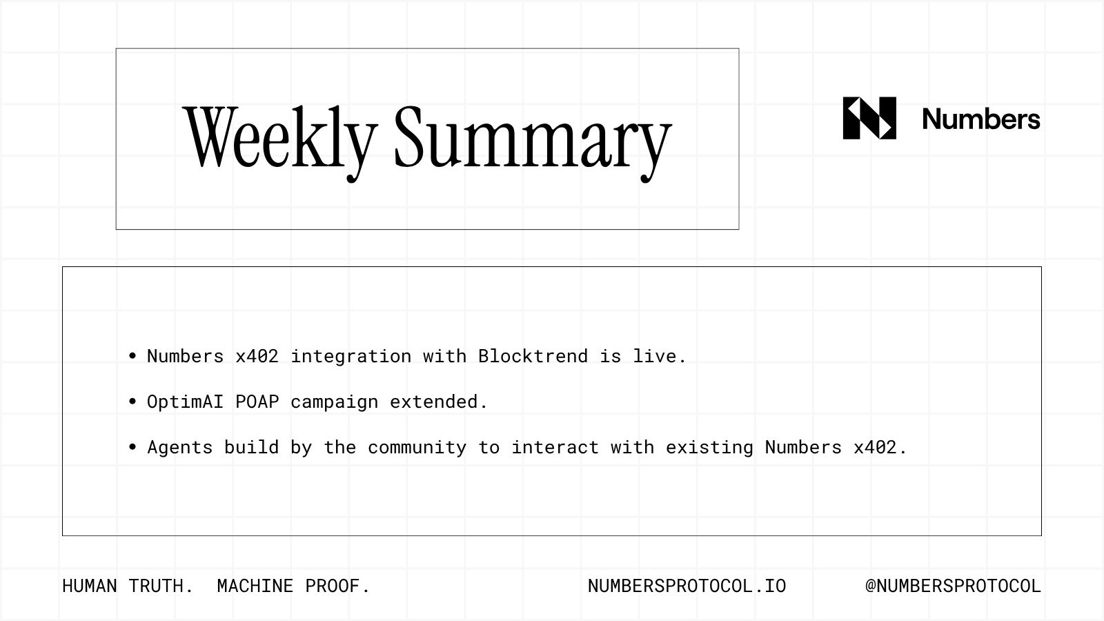 On the builder side, a community member took auditable AI a step further this week. An autonomous agent now verifies content provenance on Numbers Mainnet and records every audit as an immutable on-chain commit, a registered identity performing verification with receipts. Combined with the x402 expansion, this closes the full loop: infrastructure that makes content licensable and an agent that makes it auditable.